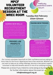 Please drop in and find out about the opportunities we have to volunteer for Medway Parents and Carers Forum. This will be held in the Wrec Room, Pentagon, Chatham, Kent